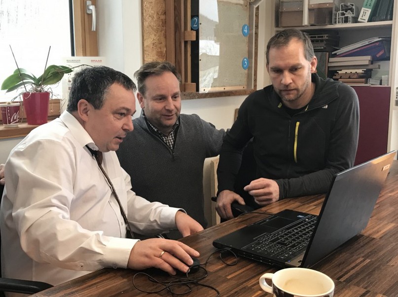 Jörg Vollmer und Peter May (v.re., mit Pro Passivhaus-Geschäftsführer Franz Freundorfer; unser Bild – Foto: Kober) sind zu Beginn des Jahrzehnts junge Unternehmer im Holz- und Passivhausbau, als sie auf die im Entstehen begriffene Kooperation SmartWin von Fenster-Daniel Düsentrieb Franz Freundorfer treffen. Für ihre Häuser kaufen sie Elemente zu, „im Finish top“, wie Vollmer im Rückblick sagt, „aber halt Standardfenster“. Als sie im Dunstkreis der Passivhausszene auf Freundorfers Vorträge stoßen, sind sie vom SmartWin infiziert – und wollen es zunächst einkaufen.